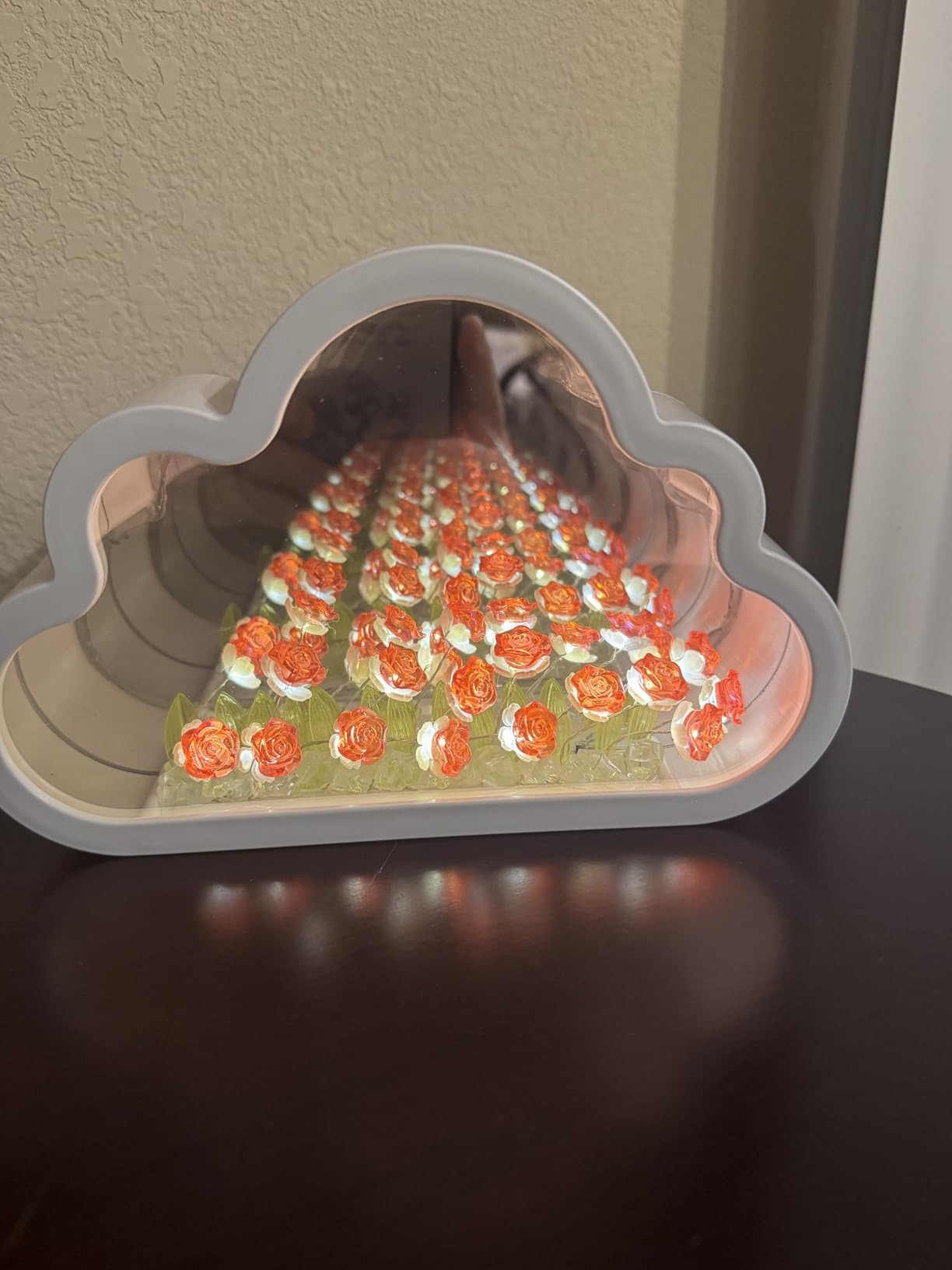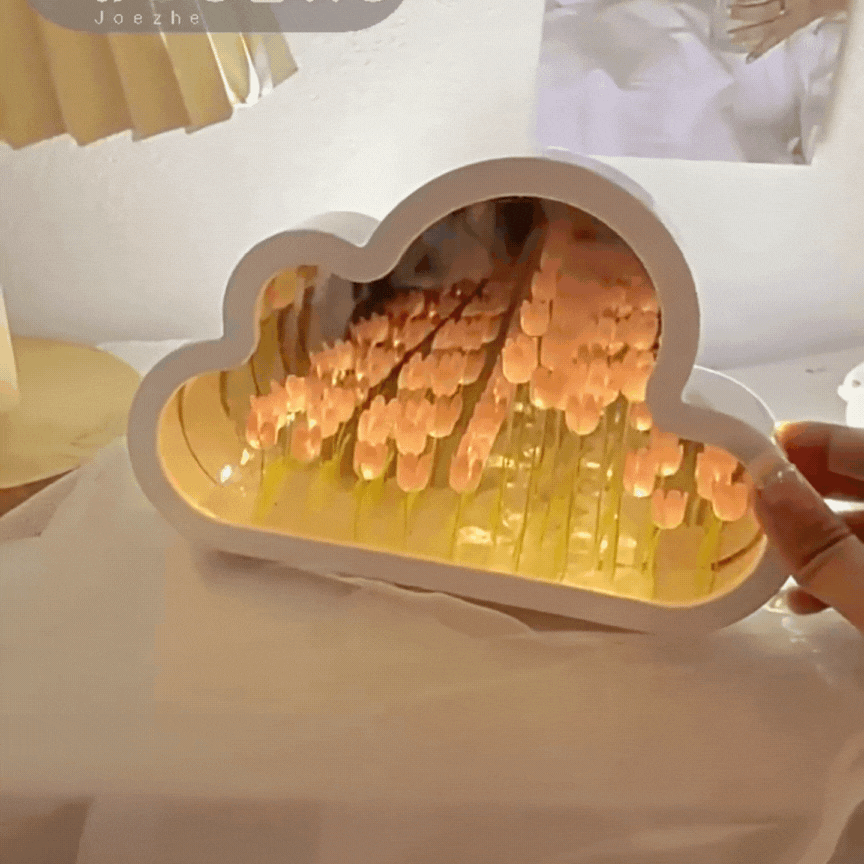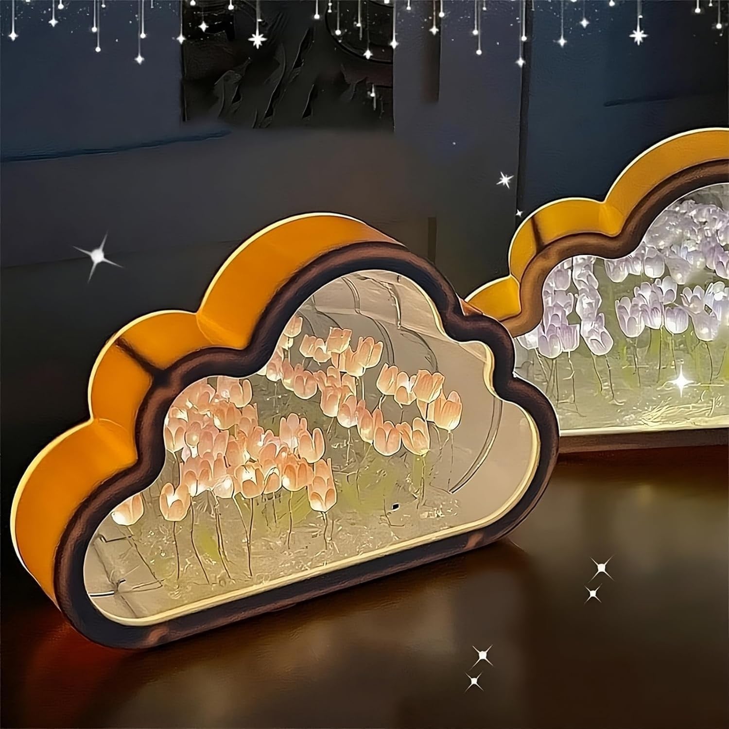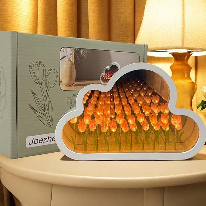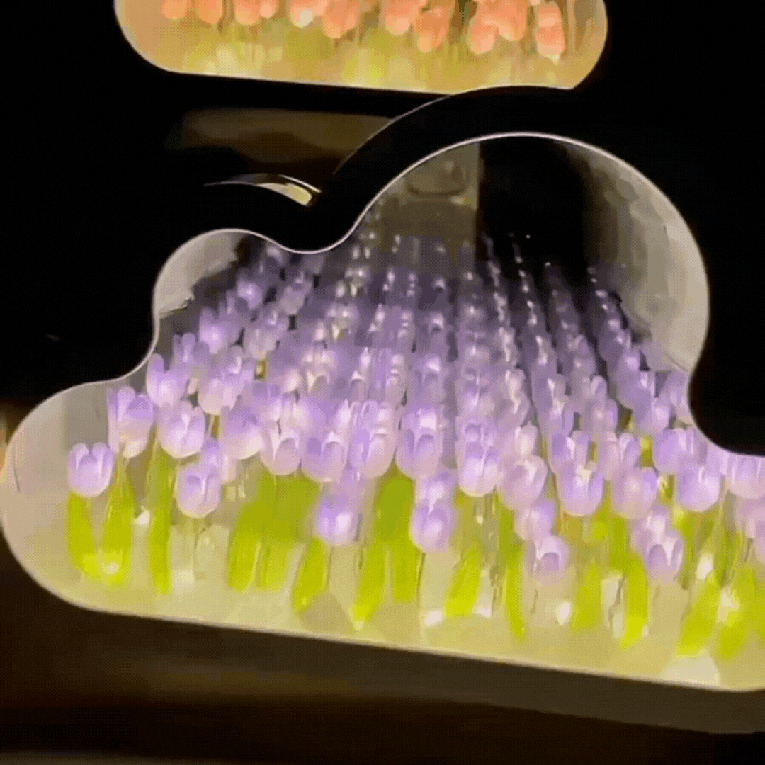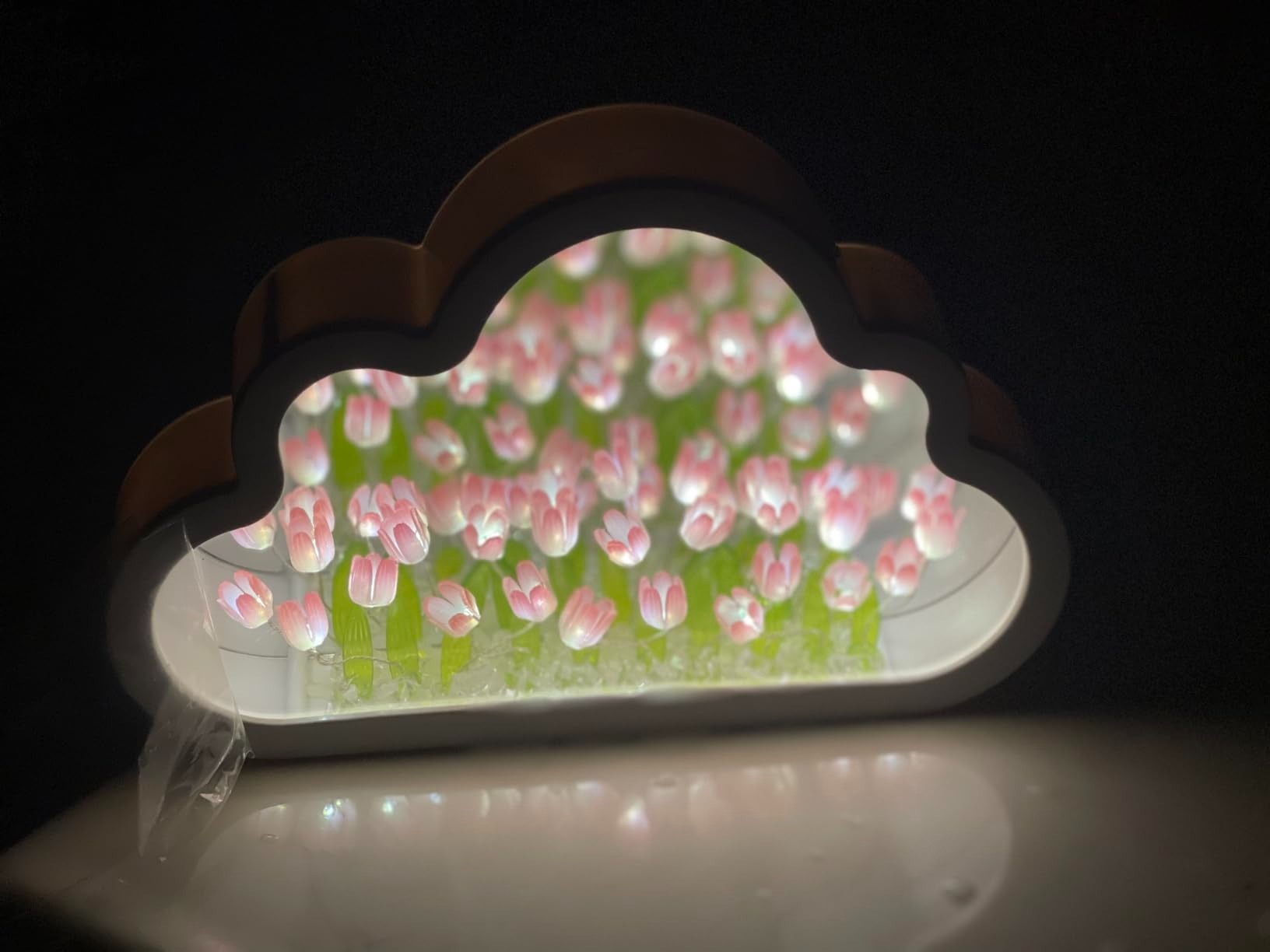 🌟 Diseño 2 en 1 – Lámpara y espejo mágico: Esta hermosa lámpara con forma de nube funciona como un espejo de alta definición cuando está apagada, y al encenderse, se transforma en una encantadora lámpara decorativa que revela delicadas flores de tulipán bajo la luz, creando una atmósfera mágica y acogedora en cualquier espacio.