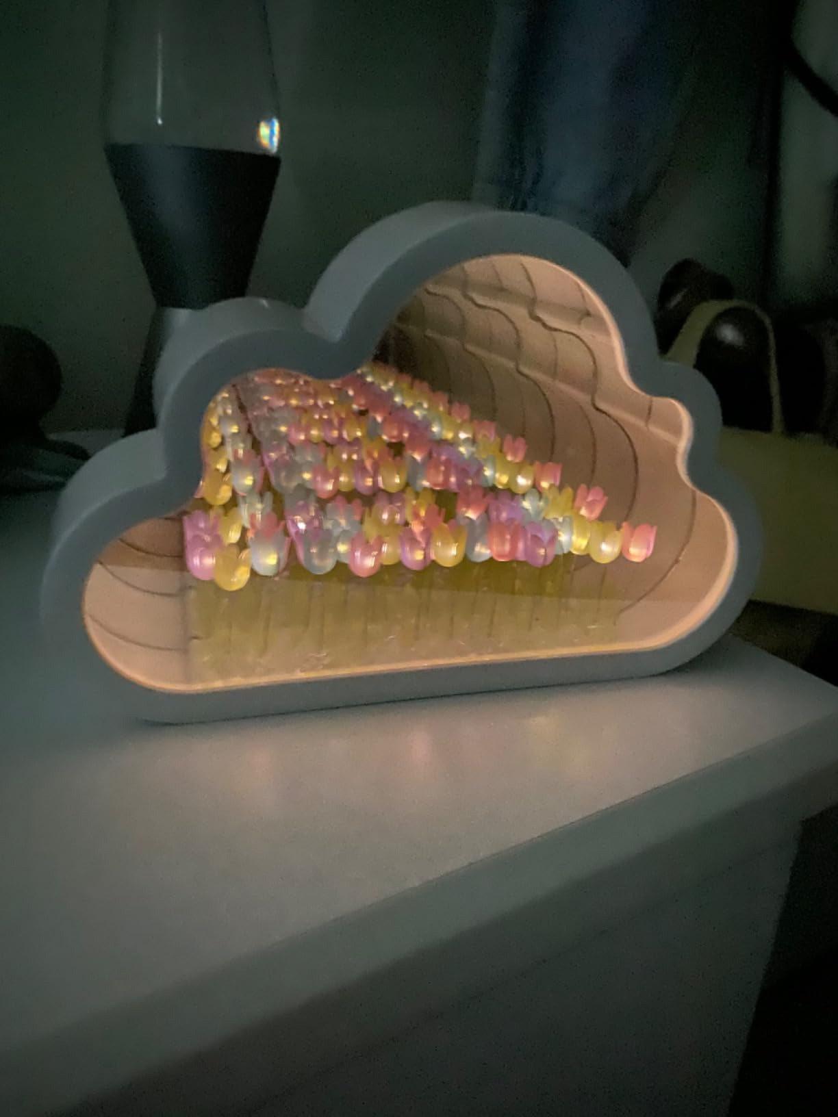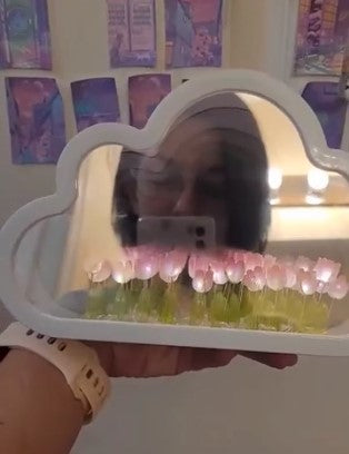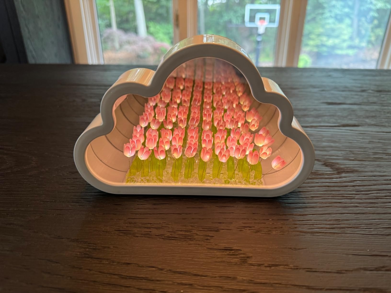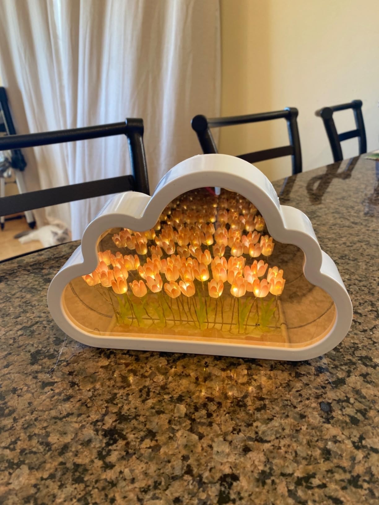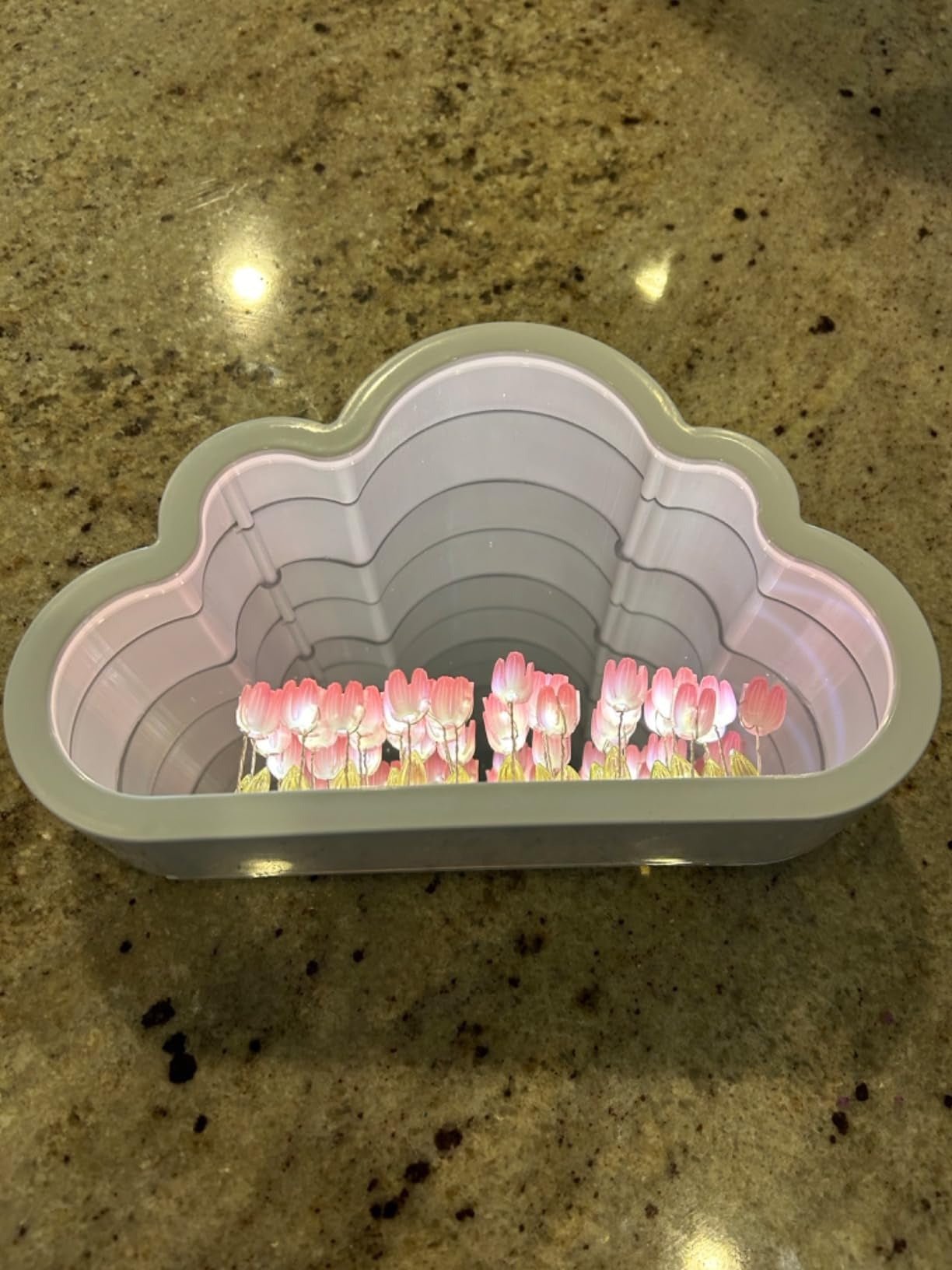 🌟 Diseño 2 en 1 – Lámpara y espejo mágico: Esta hermosa lámpara con forma de nube funciona como un espejo de alta definición cuando está apagada, y al encenderse, se transforma en una encantadora lámpara decorativa que revela delicadas flores de tulipán bajo la luz, creando una atmósfera mágica y acogedora en cualquier espacio.